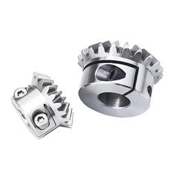 Miter gear with fastening mechanism. Keyway slot and other machining for shaft not required, making adjustments easy during assembly.