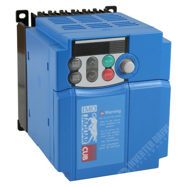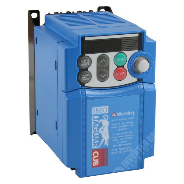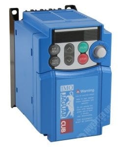 IMO iDrive2 Series AC Inverter for 0.4kW (0.5HP) 230V 3 phase motor to 2.5A. Operates in VxF control and converts fixed frequency single phase 230V input to variable frequency three phase 230V to control the speed of a standard AC Induction motor.