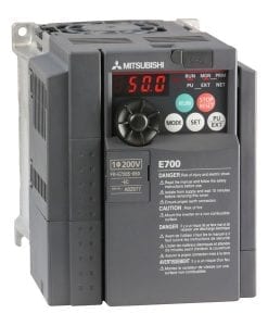 Mitsubishi FR-E700 Series AC Frequency Inverter for 0.1kW (1/8HP) 3 Phase motor in VxF or Sensorless Vector control to 0.8A. Simple set-up and converts single phase 230V input to three phase 230V for a standard AC Induction motor.
