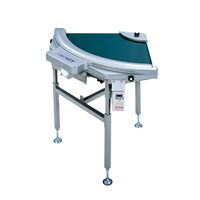 Belt curve conveyor that incorporates the features of a drive system. Because the tail rollers of both sides use ø20 straight rollers, even small transported items are transferred smoothly.
