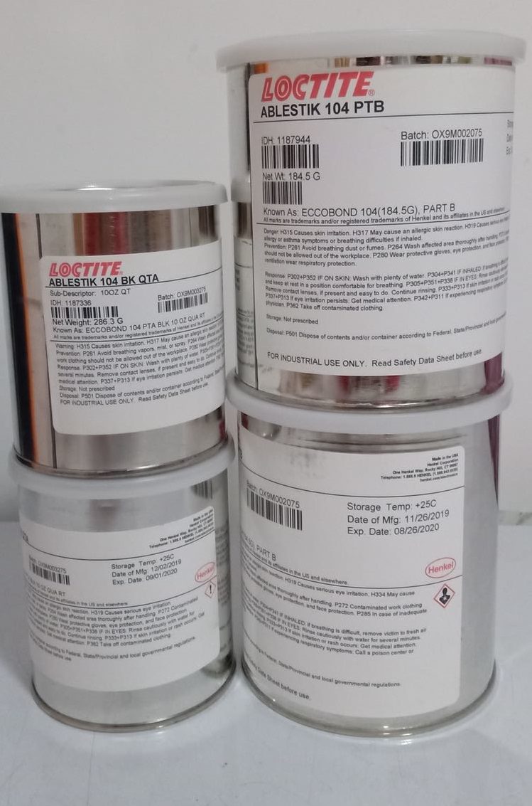 Henkel Loctite Ablestik 104 Black, formerly Emerson and Cuming ECCOBOND, is a two component, heat curing, liquid epoxy adhesive that is used for the assembly of thermoset plastics, metal, ceramics, and glass. It offers a long pot life, high shear strength, non-conductive properties, excellent high temperature and chemical resistance. Part A, 10 oz Can.